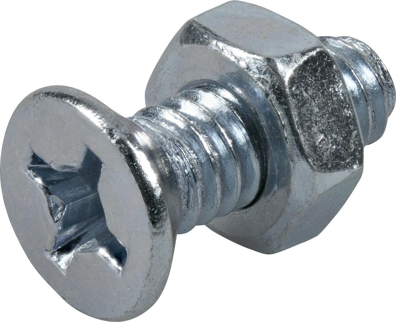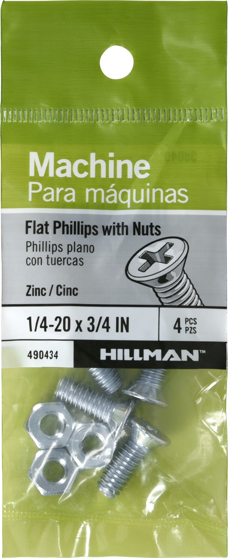 Common applications include machines, appliances, electronic devices, and vehicles. Flat-head Phillips machine screws with nuts. 4 pieces per retail package. Phillips drive.