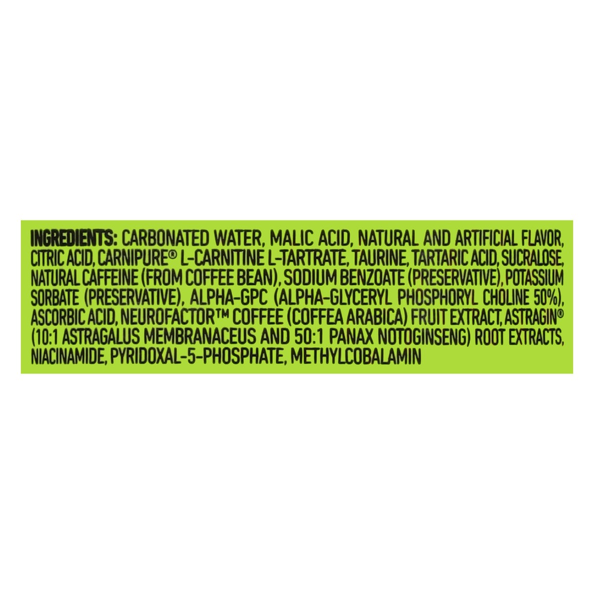 Carbonated Water, Malic Acid, Natural and Artificial Flavor, Citric Acid, Carnipure L-Carnitine L-Tartrate, Taurine, Tartaric Acid, Sucralose, Natural Caffeine (from Coffee Bean), Sodium Benzoate (Pre…