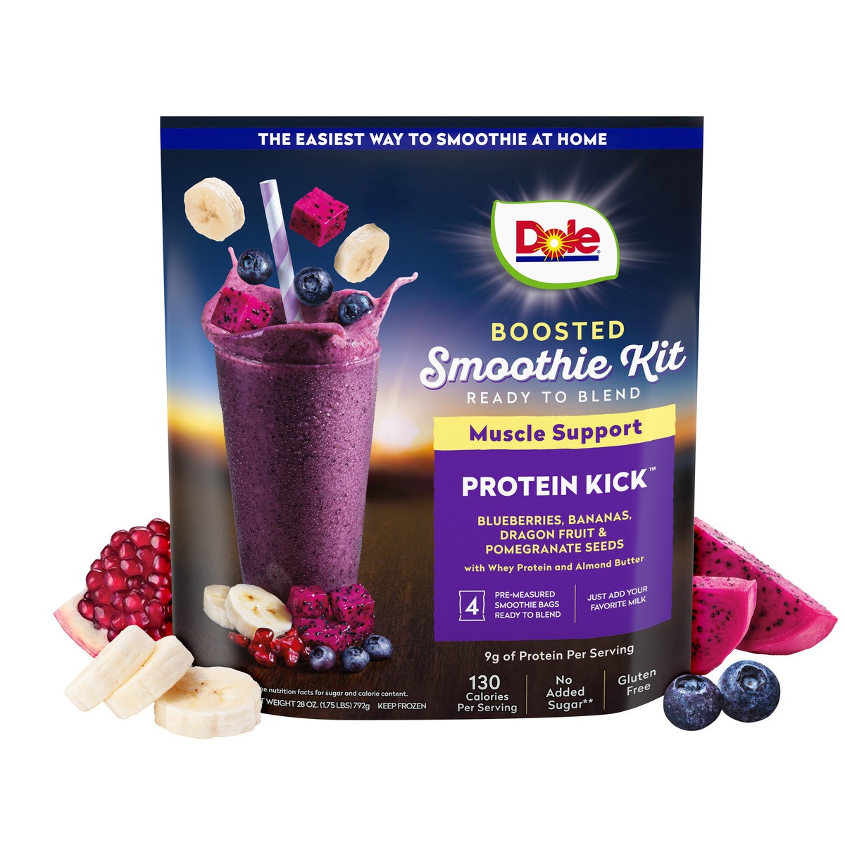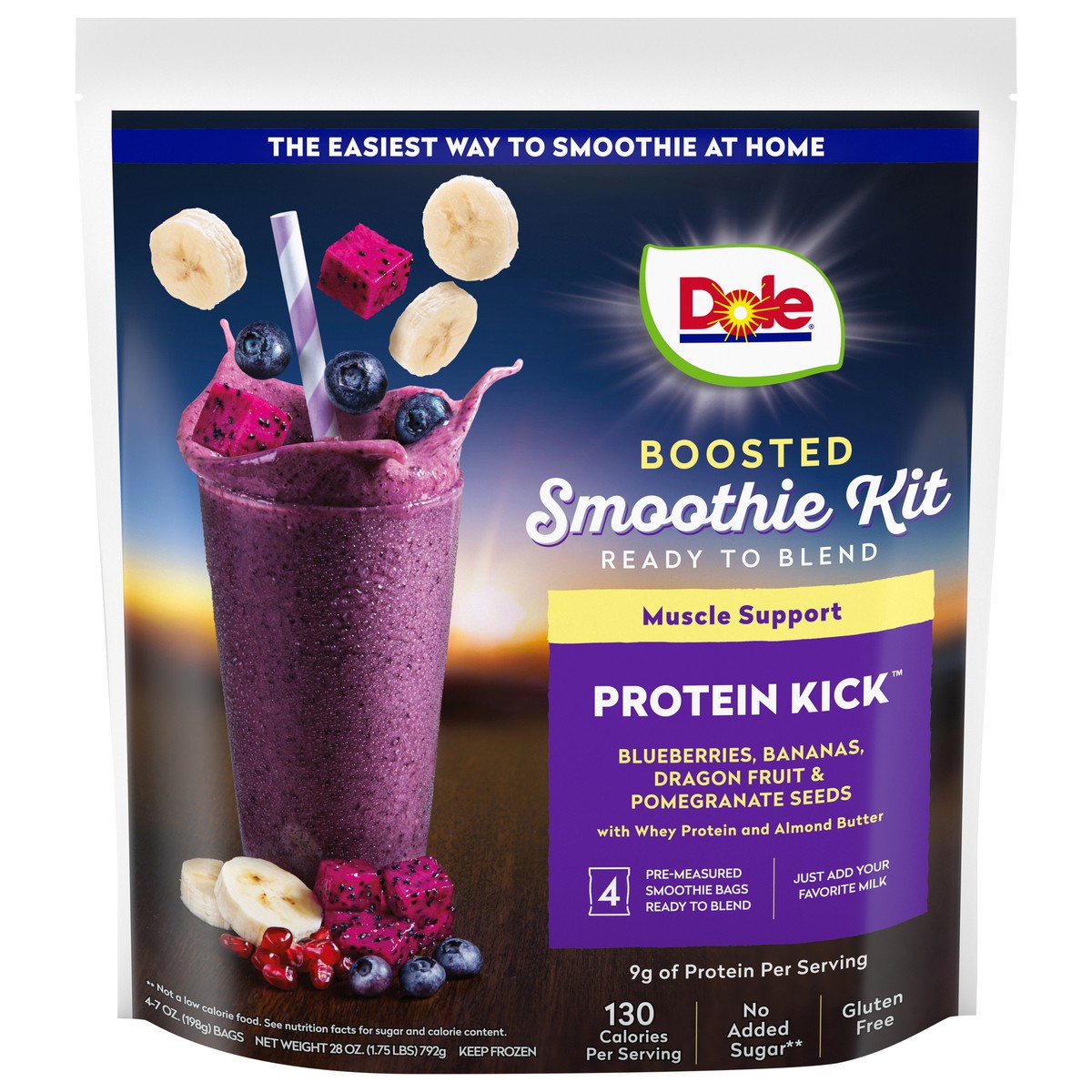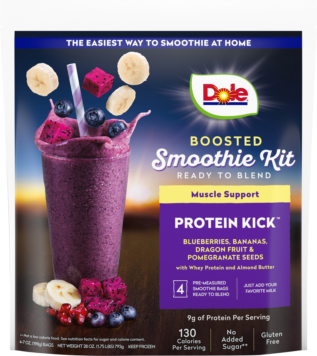 Dole Protein Kick Smoothie Blend combines blueberries, bananas, dragon fruit, pomegranate seeds, and protein cubes, frozen to preserve peak flavor and freshness