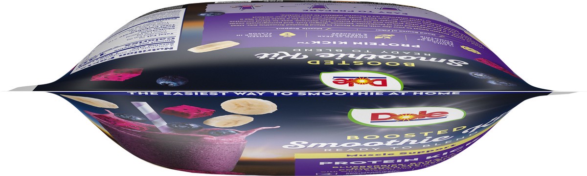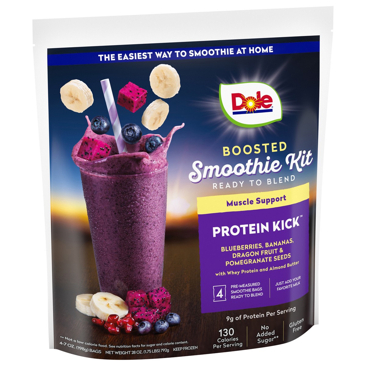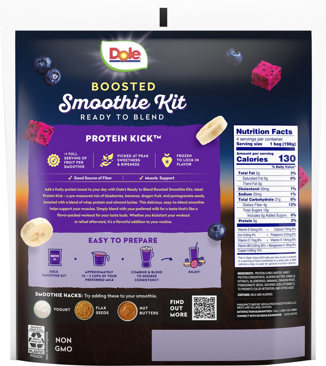 Dole Protein Kick Smoothie Blend combines blueberries, bananas, dragon fruit, pomegranate seeds, and protein cubes, frozen to preserve peak flavor and freshness