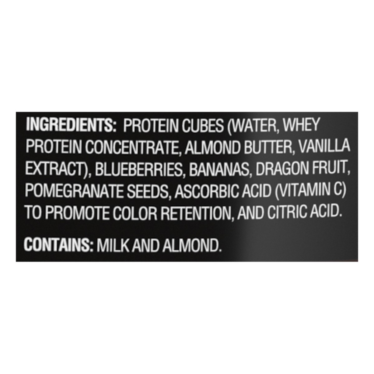 Protein Cubes (Water, Whey Protein Concentrate, Almond Butter, Vanilla Extract), Blueberries, Bananas, Dragon Fruit, Pomegranate Seeds, Ascorbic Acid (Vitamin C) to Promote Color Retention, and Citric…