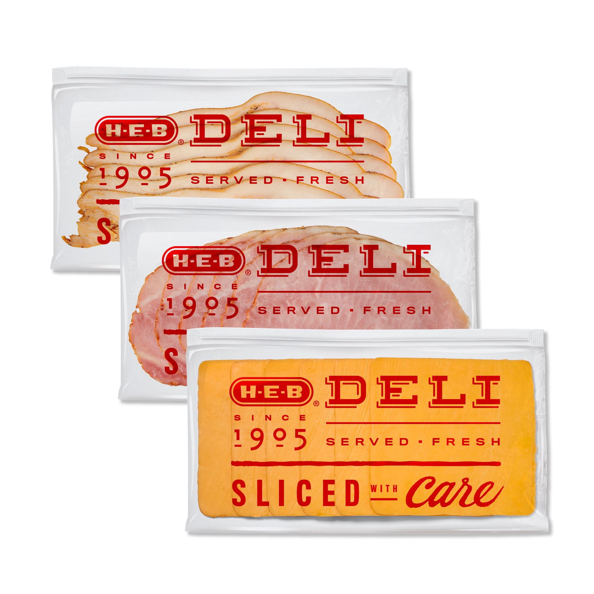 Discover the convenience and quality of our H-E-B Deli Meat and Cheese Sandwich Sliced Bundle. Featuring an assortment of our deli Post Oak Smoked favorites Turkey Breast, Ham and Cheddar cheese all c…