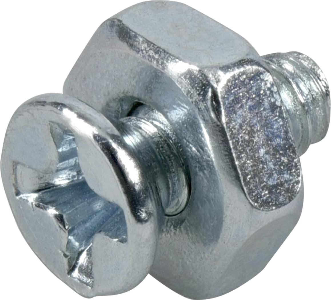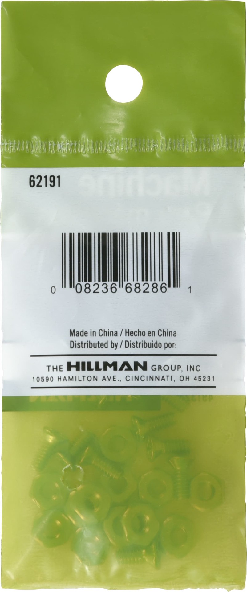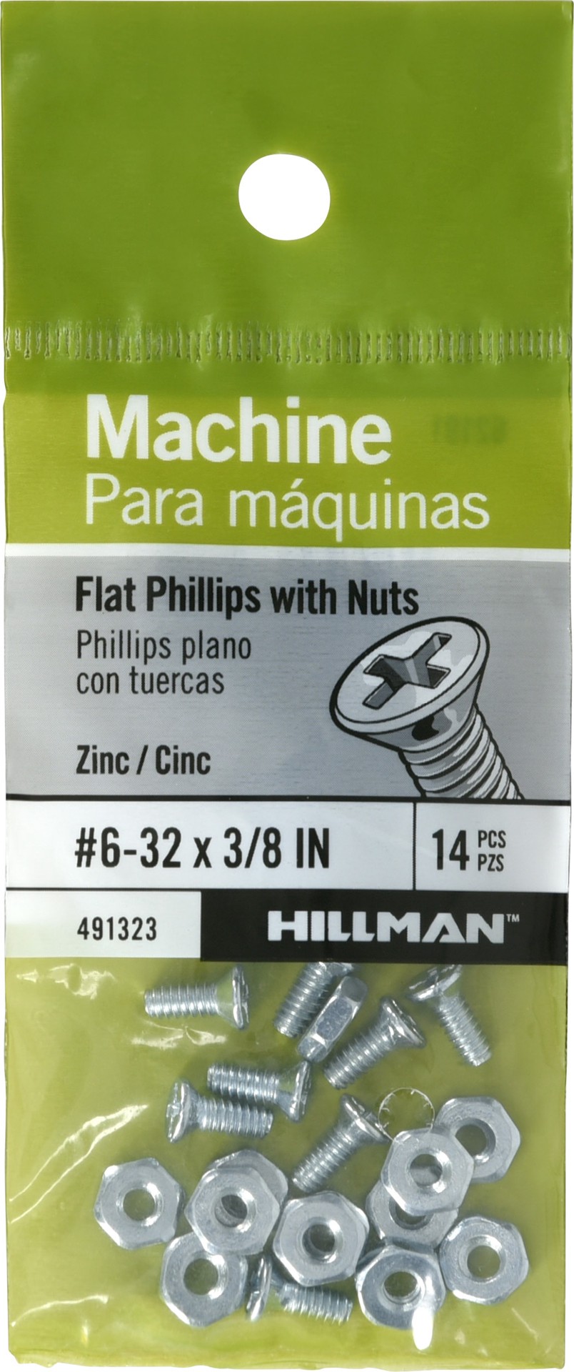 Common applications include machines, appliances, electronic devices, and vehicles. Flat-head Phillips machine screws with nuts. 14 pieces per retail package. Phillips drive.