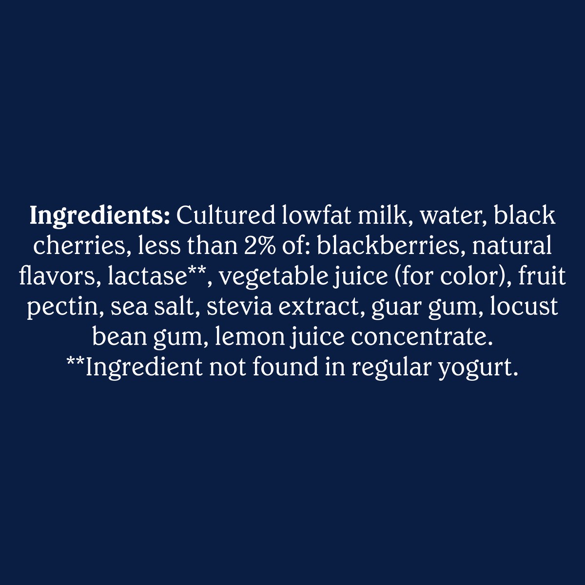 Cultured Lowfat Milk, Water, Black Cherries, Less than 2% of: Blackberries, Natural Flavors, Lactase**, Vegetable Juice (for Color), Fruit Pectin, Sea Salt, Stevia Extract, Guar Gum, Locust Bean Gum, …