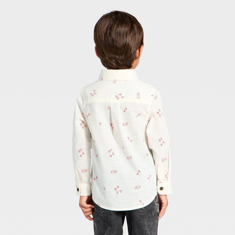 Add cute V-Day style to your toddler's wardrobe with this Valentine's Day 'XO' Long-Sleeve Button-Down Shirt from Cat & Jack™. This regular-fit shirt with a shirttail hem features red heart and XO pri…