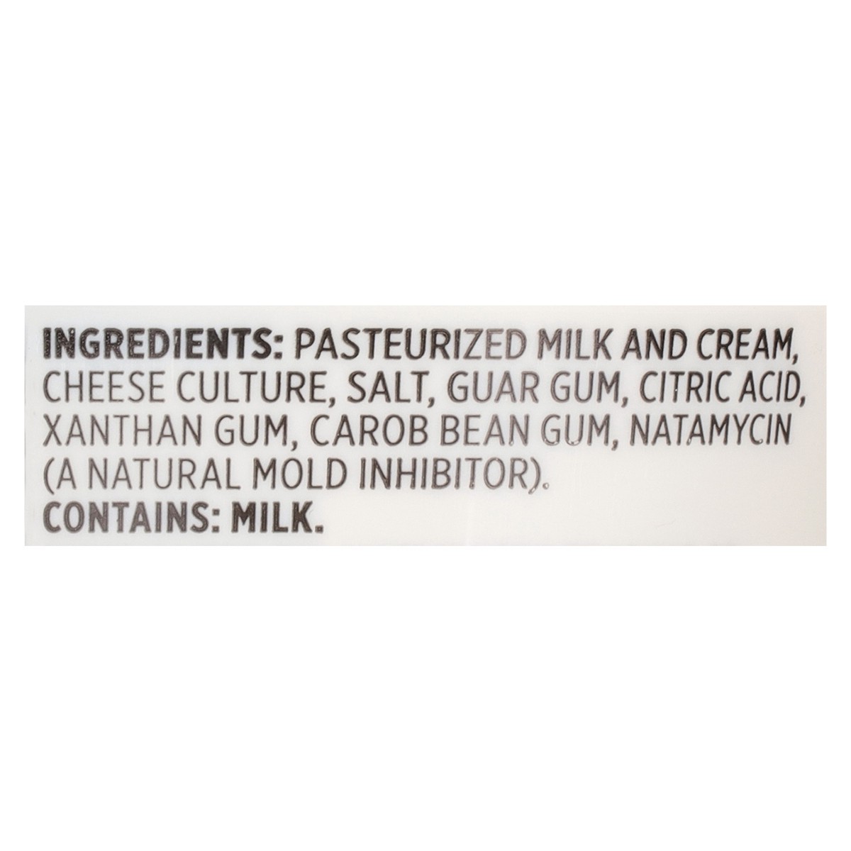 Pasteurized Milk and Cream, Cheese Culture Salt, Guar Gum, Citric Acid Carbon Bean Gum, Xanthan, Gum, Natamycin (a Natural Mold Inhibitor).