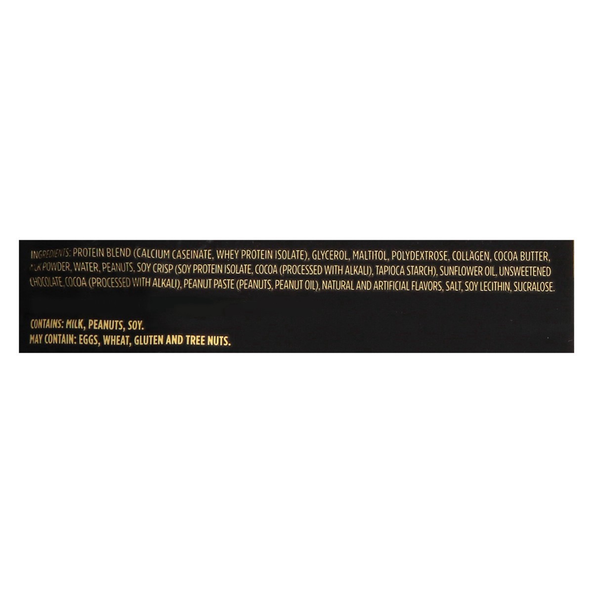 Milk Protein Blend (Calcium Caseinate, Whey Protein Concentrate, Whey Protein Isolate), Glycerin, Bovine Collagen Hydrolysate, Maltitol, Polydextrose, Water, Cocoa Butter, Dry Whole Milk, Peanut Paste…