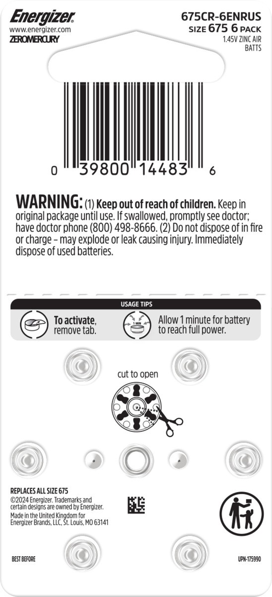 Energizer Hearing Aid Zinc Air 675 Batteries - 6 Count