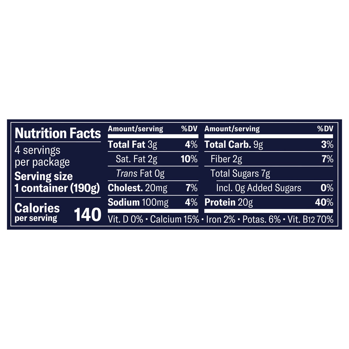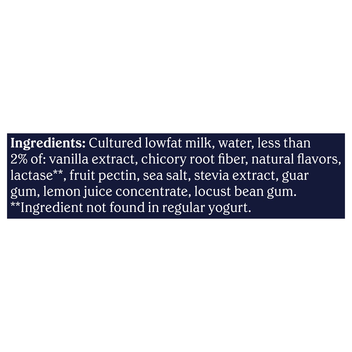 Cultured Lowfat Milk, Water, Less than 2% of: Vanilla Extract, Chicory Root Fiber, Natural Flavors, Lactase**, Fruit Pectin, Sea Salt, Stevia Extract, Guar Gum, Lemon Juice Concentrate, Locust Bean Gu…