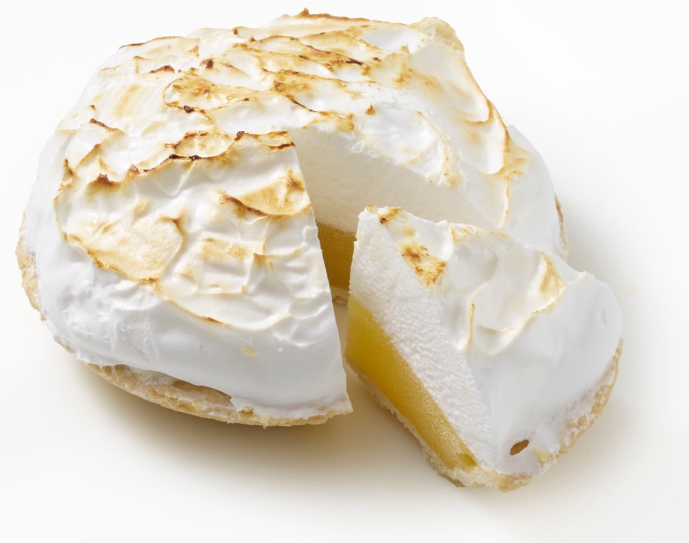 An 8-inch pie consisting of a tart, soft lemon filling topped with sweet, light-brown tipped meringue in a tender, flaky crust.