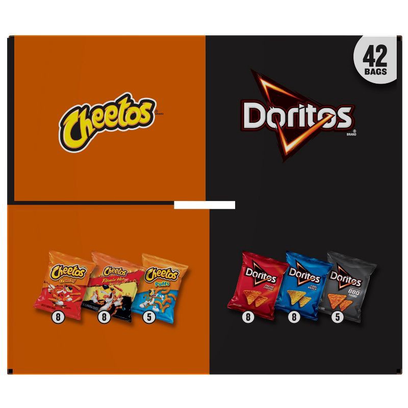 - 42 individually wrapped bags of your favorite tortilla chips and cheese flavored snacks from Doritos and Cheetos