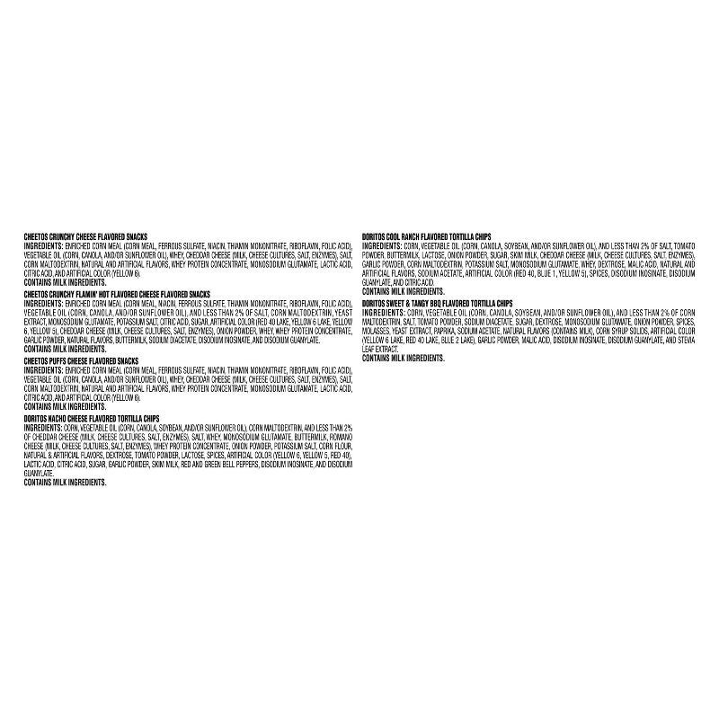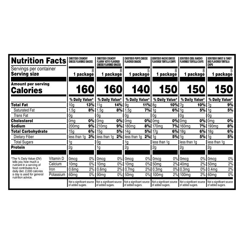- (8) Doritos Nacho Cheese, (8) Doritos Cool Ranch, (5) Doritos Hot & Spicy BBQ, (8) Cheetos Crunchy, (8) Cheetos Flamin' Hot, and (5) Cheetos Puffs