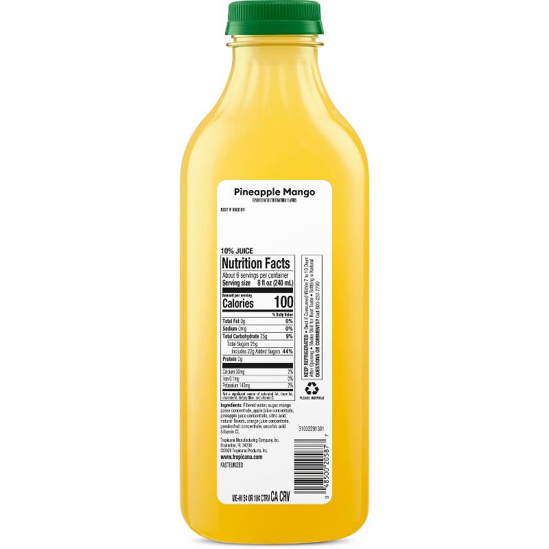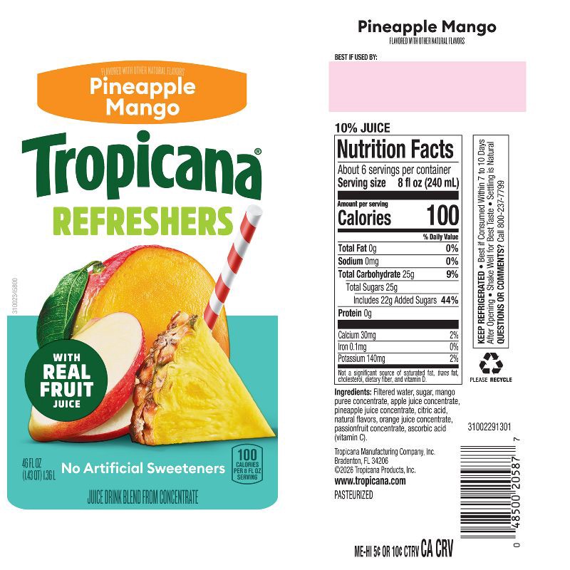Tropicana Refreshers Pineapple Mango juice drink is made with real fruit juice, no artificial sweeteners, and has 100 calories per 8 fl oz serving. Savor the combination of unique flavors with the swe…