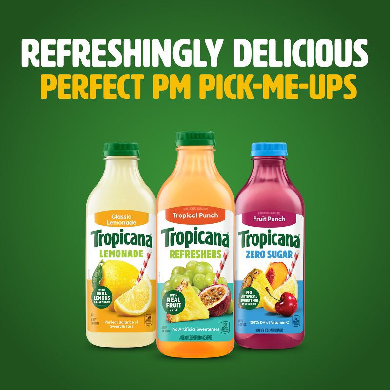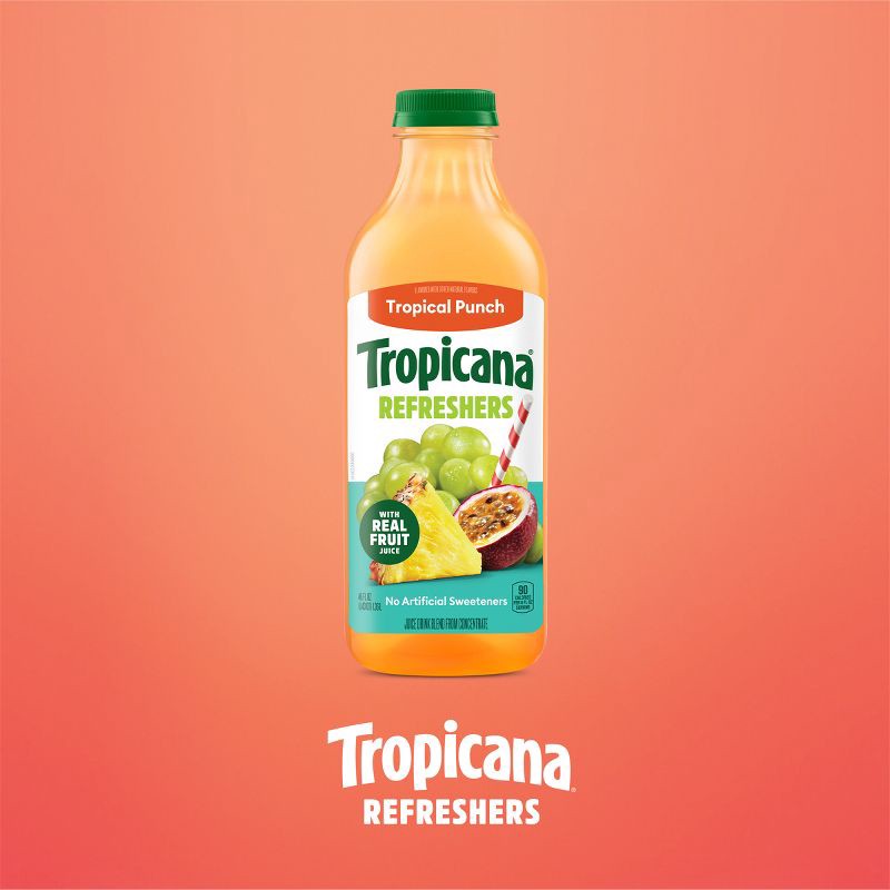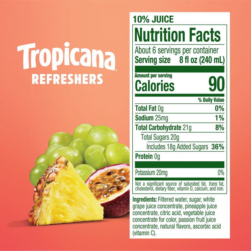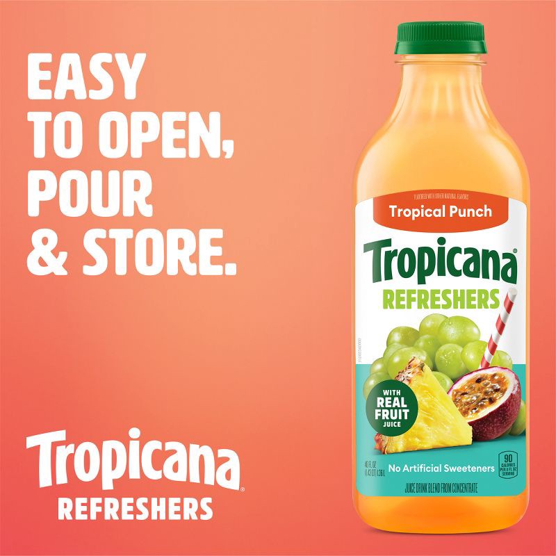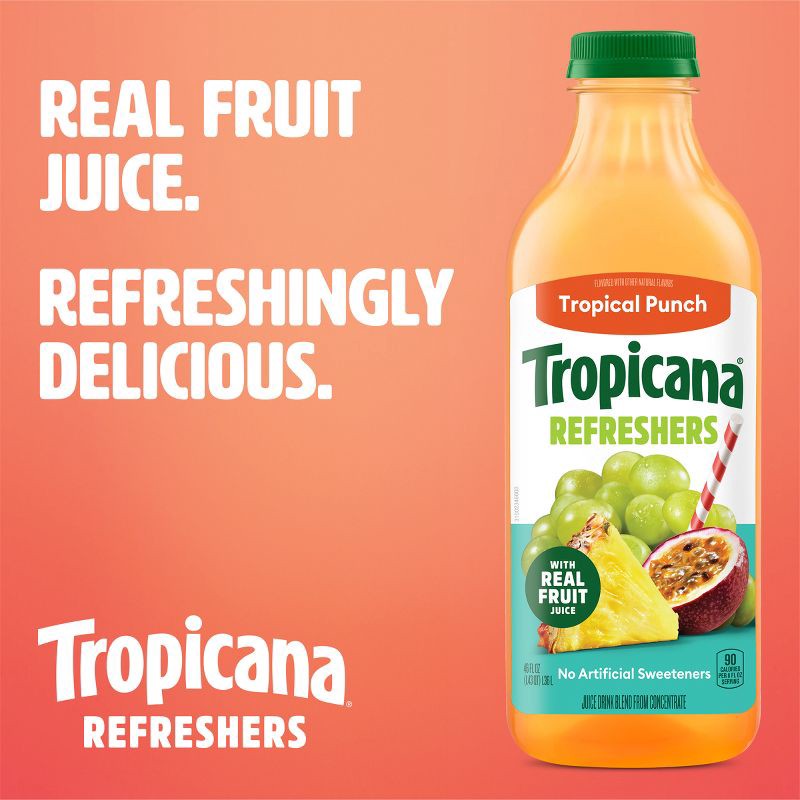 Tropicana Refreshers Tropical Punch juice drink is made with real fruit juice, no artificial sweeteners, and has 90 calories per 8 fl oz serving. Savor the combination of unique flavors with the tropi…