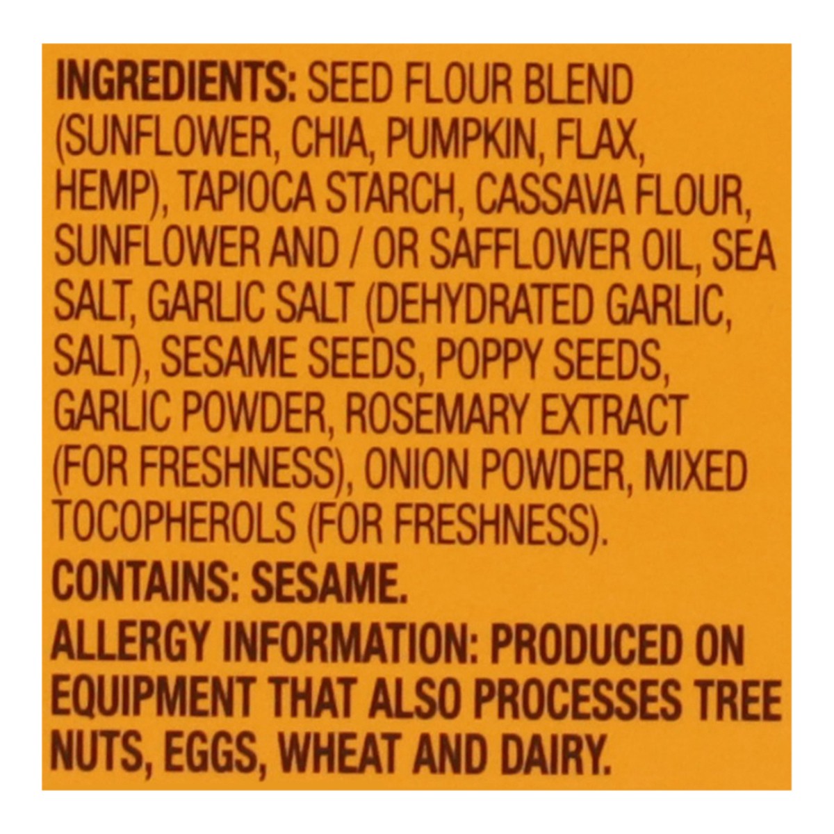 Seed Flour Blend (Sunflower, Chia, Pumpkin, Flax, Hemp), Tapioca Starch, Cassava Flavor, Sunflower and/or Safflower Oil, Sesame Seeds, Sea Salt, Garlic Sat, (Dehydrated Garlic, Salt), Sesame Seed, Pop…