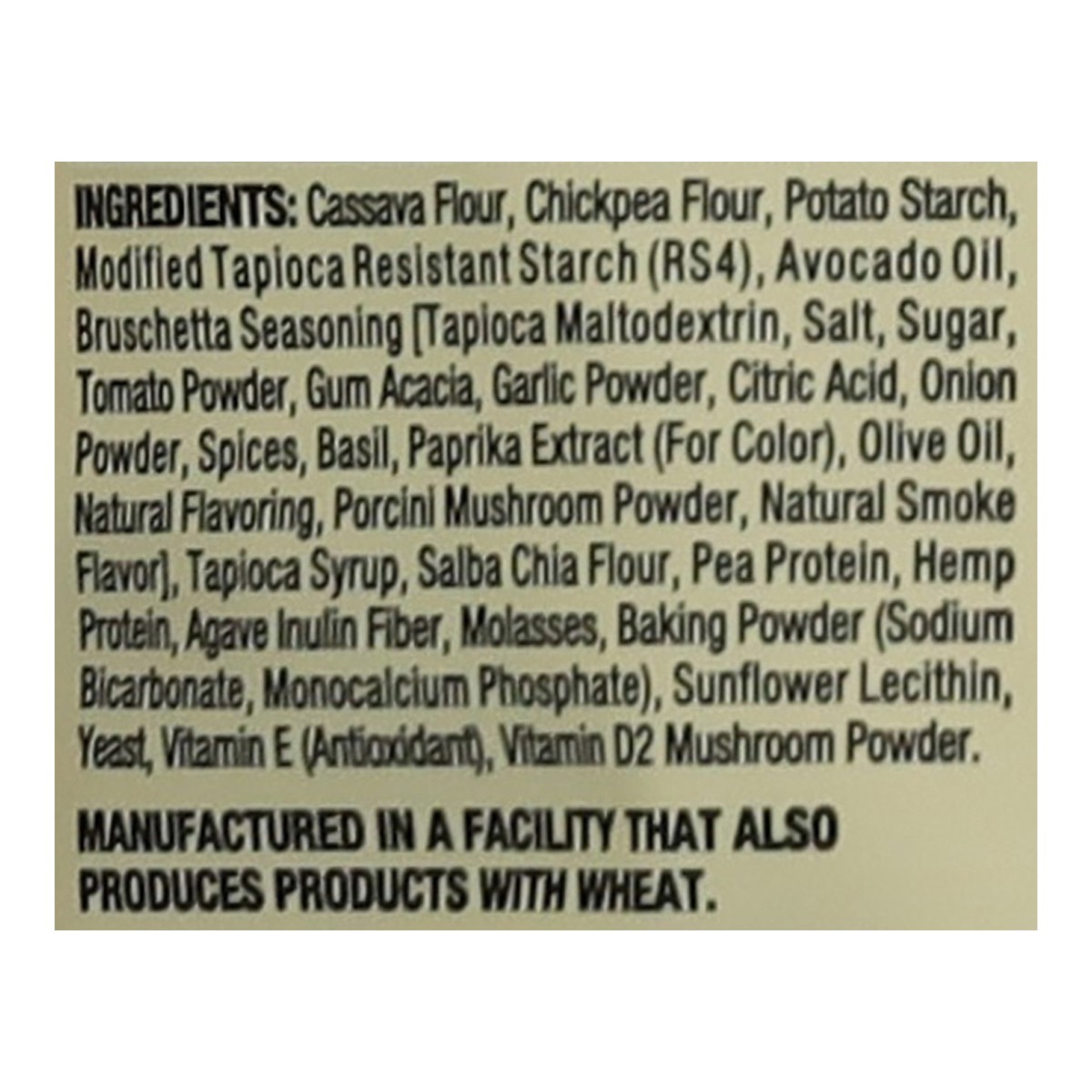 Cassava Flour, Chickpea Flour, Potato Starch, Modified Tapioca Resistant Starch (Rs4), Avocado Oil, Bruschetta Seasoning [Tapioca Maltodextrin, Salt, Sugar, Tomato Powder, Gum Acacia, Garlic Powder, C…