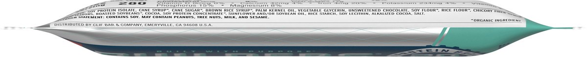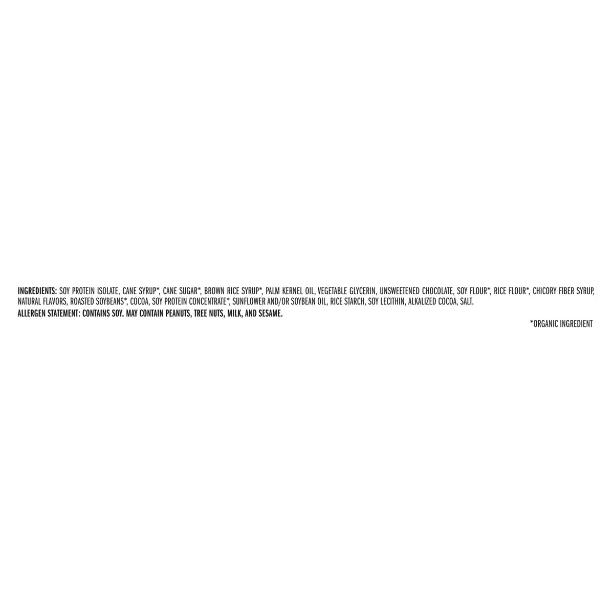 INGREDIENTS: SOY PROTEIN ISOLATE, CANE SYRUP*, CANE SUGAR*, BROWN RICE SYRUP*, PALM KERNEL OIL, VEGETABLE GLYCERIN, UNSWEETENED CHOCOLATE, SOY FLOUR*, RICE FLOUR*, CHICORY FIBER SYRUP, NATURAL FLAVORS…