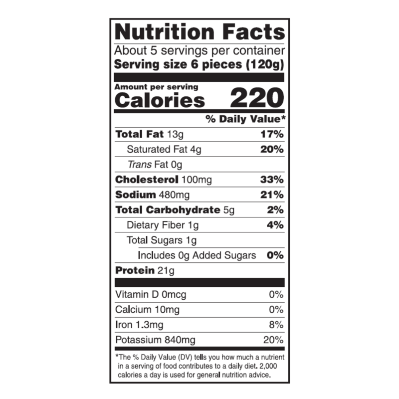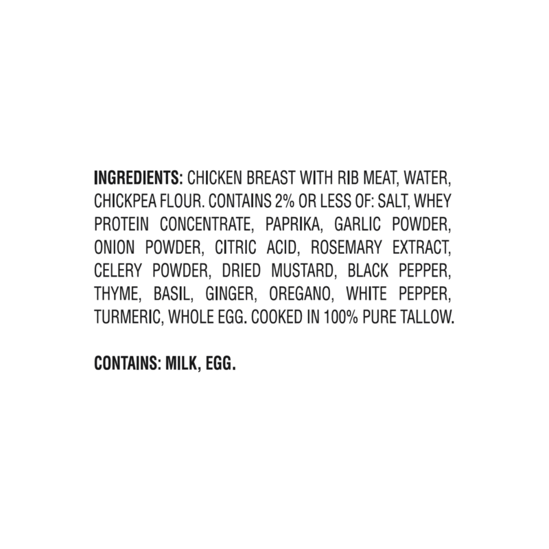 Chicken Breast with Rib Meat, Water, Chickpea Flour, Contains 2% or Less of: Salt, Whey Protein Concentrate, Paprika, Garlic Powder, Onion Powder, Citric Acid, Rosemary Extract, Celery Powder, Dried M…