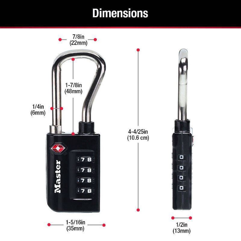 The Master Lock No. 4696D Set Your Own Combination TSA-Accepted Luggage Lock features a 1-5/16 inch (35mm) wide metal body for durability. nThe 1/4 inch (6mm) diameter shackle is 1-7/8 inch (48mm) lon…