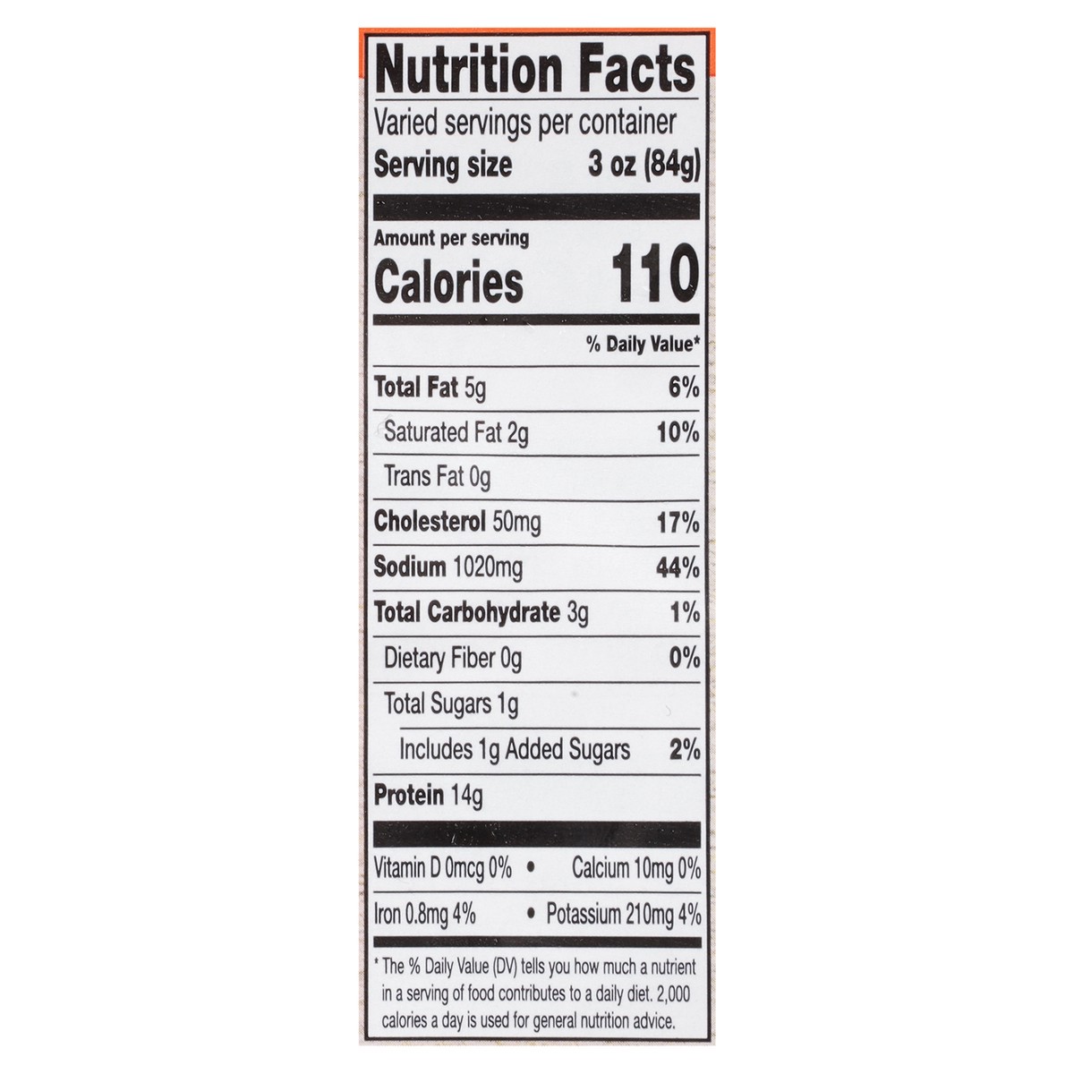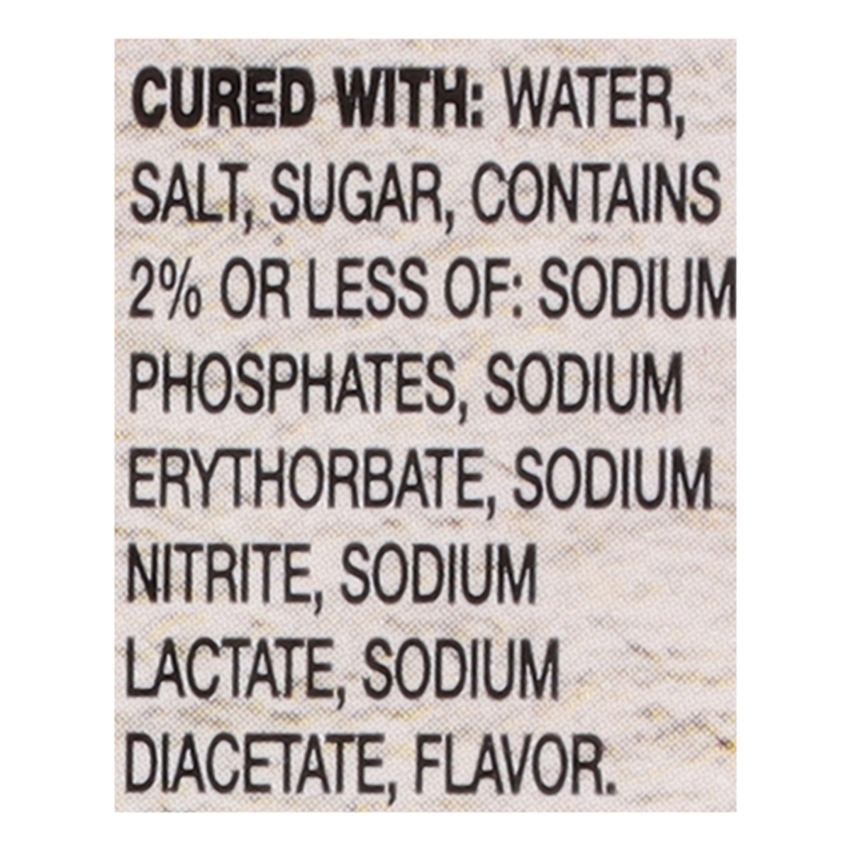 Cured with: Water, Salt, Sugar, Contains 2% or Less of: Sodium Phosphates, Sodium Erythorbate, Sodium Nitrite, Sodium Lactate, Sodium Diacetate, Flavor.