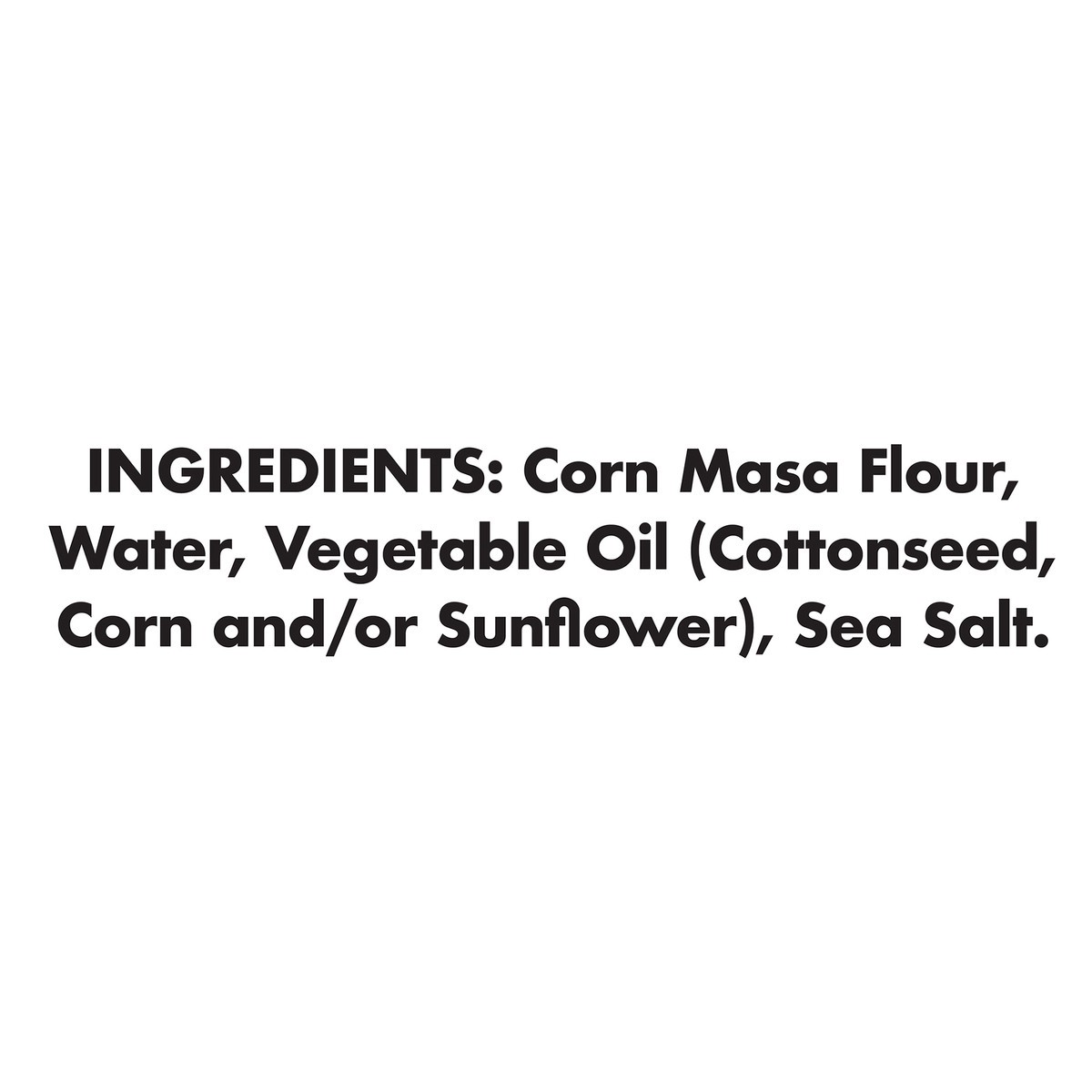 Corn Masa Flour, Water, Vegetable Oil (Cottonseed, Corn and/or Sunflower), Sea Salt.