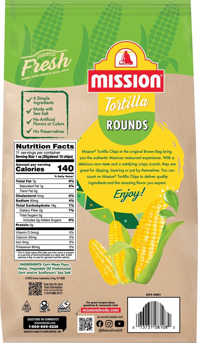 No preservatives. Made with sea salt. No artificial flavors or colors. Mission Tortilla Chips in the original Brown Bag bring you the authentic Mexican restaurant experience. With a delicious corn tas…