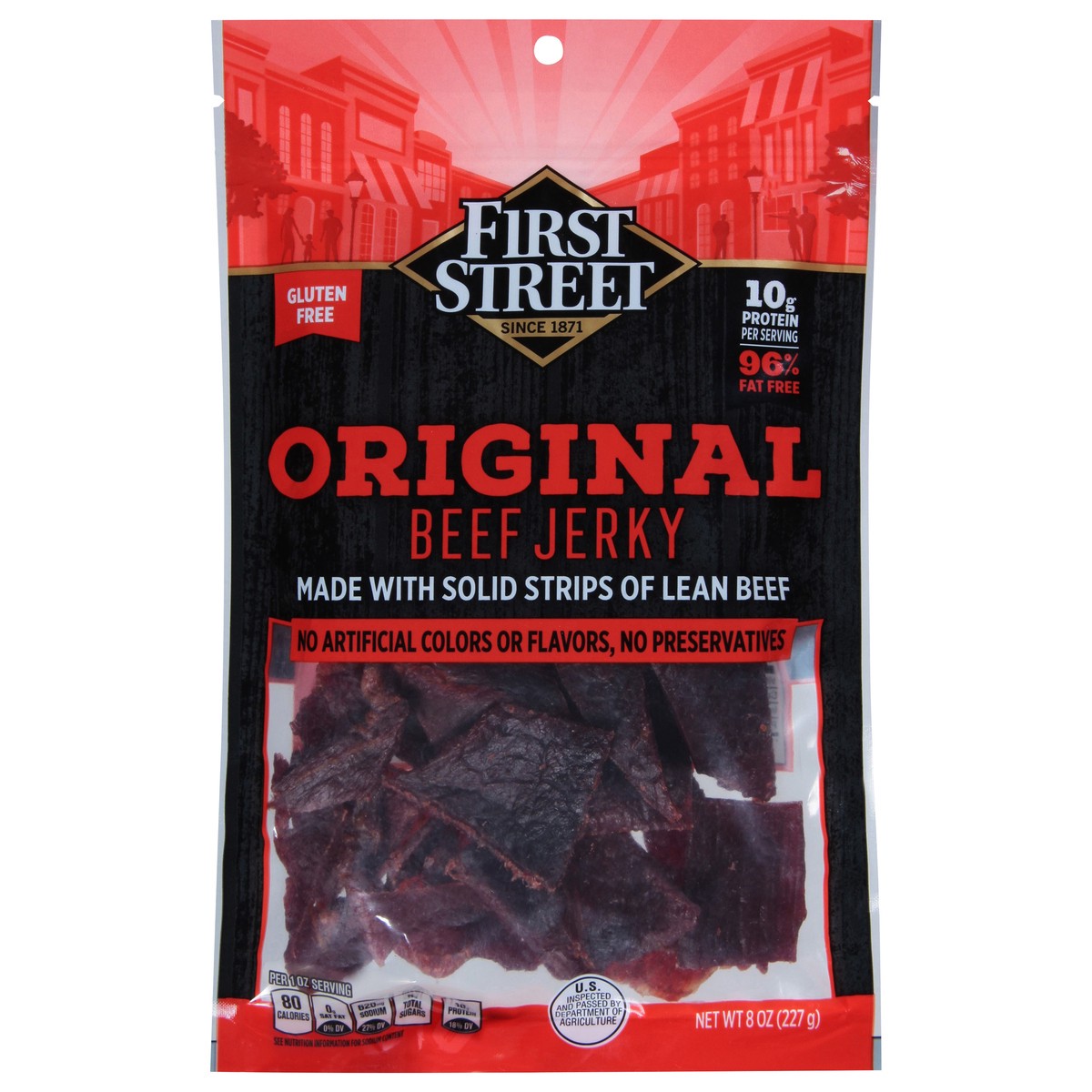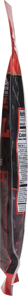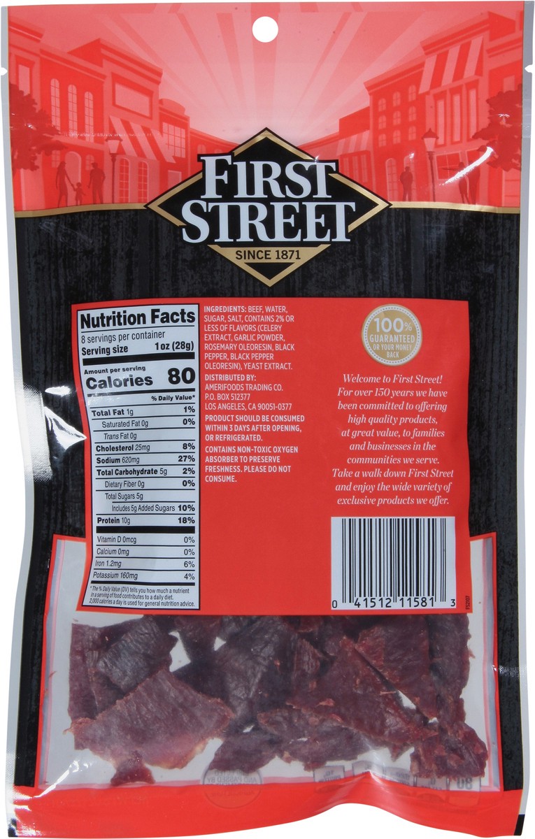Strips of premium lean beef. Natural smoke flavor added. Per 1 oz Serving: 90 calories; 0 g sat fat (0% DV); 380 mg sodium (16% DV); 5 g sugars. 97% fat free. Nitrite free. Since 1871. Welcome to Firs…