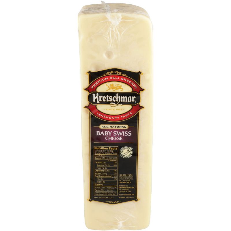 - The mild flavor and buttery taste of Kretschmar Premium Deli Baby Swiss Cheese makes it a delicious addition to sandwiches and burgers
