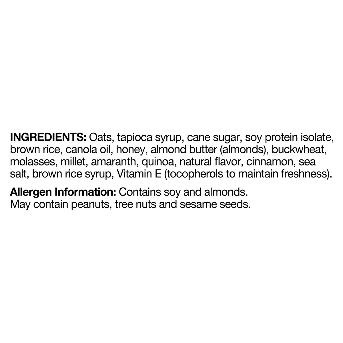 Oats, Tapioca Syrup, Cane Sugar, Soy Protein Isolate, Brown Rice, Canola Oil, Honey, Almond Butter (Almonds), Buckwheat, Molasses, Millet, Amaranth, Quinoa, Natural Flavor, Cinnamon, Sea Salt, Brown R…