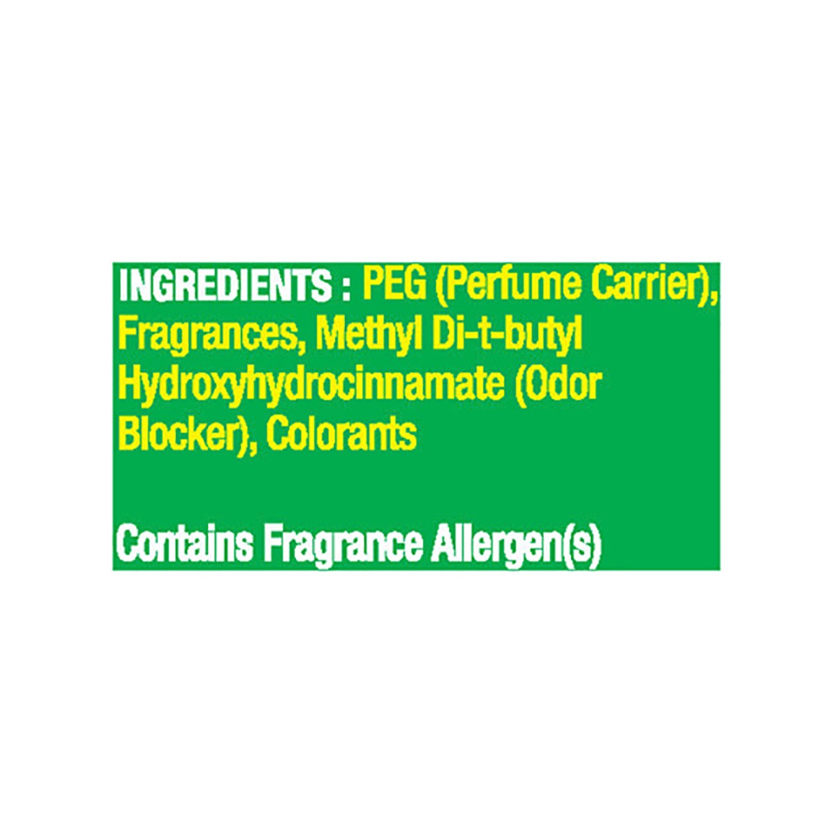 PEG (Perfume Carrier), Fragrances, Methyl Di-T-Butyl Hydroxyhydrocinnamate (Odor Blocker), Colorants.