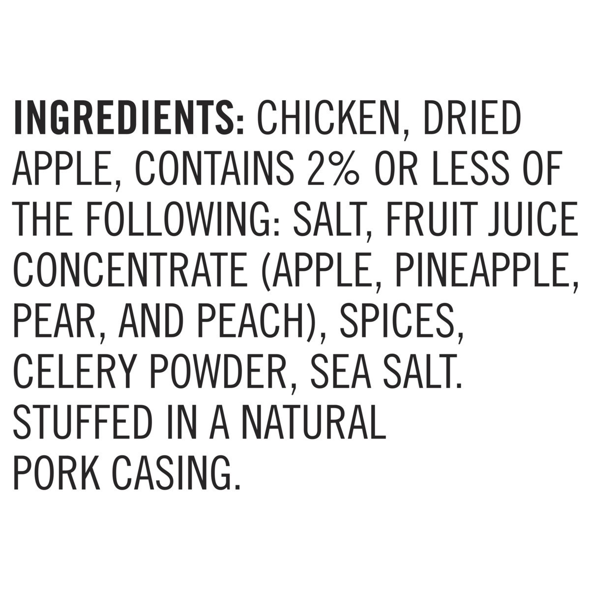 Chicken, dried apples, apple juice concentrate, chicken broth, contains 2% or less of: brown sugar, cultured celery powder, salt, sea salt, spices. Stuffed in a natural pork casing.