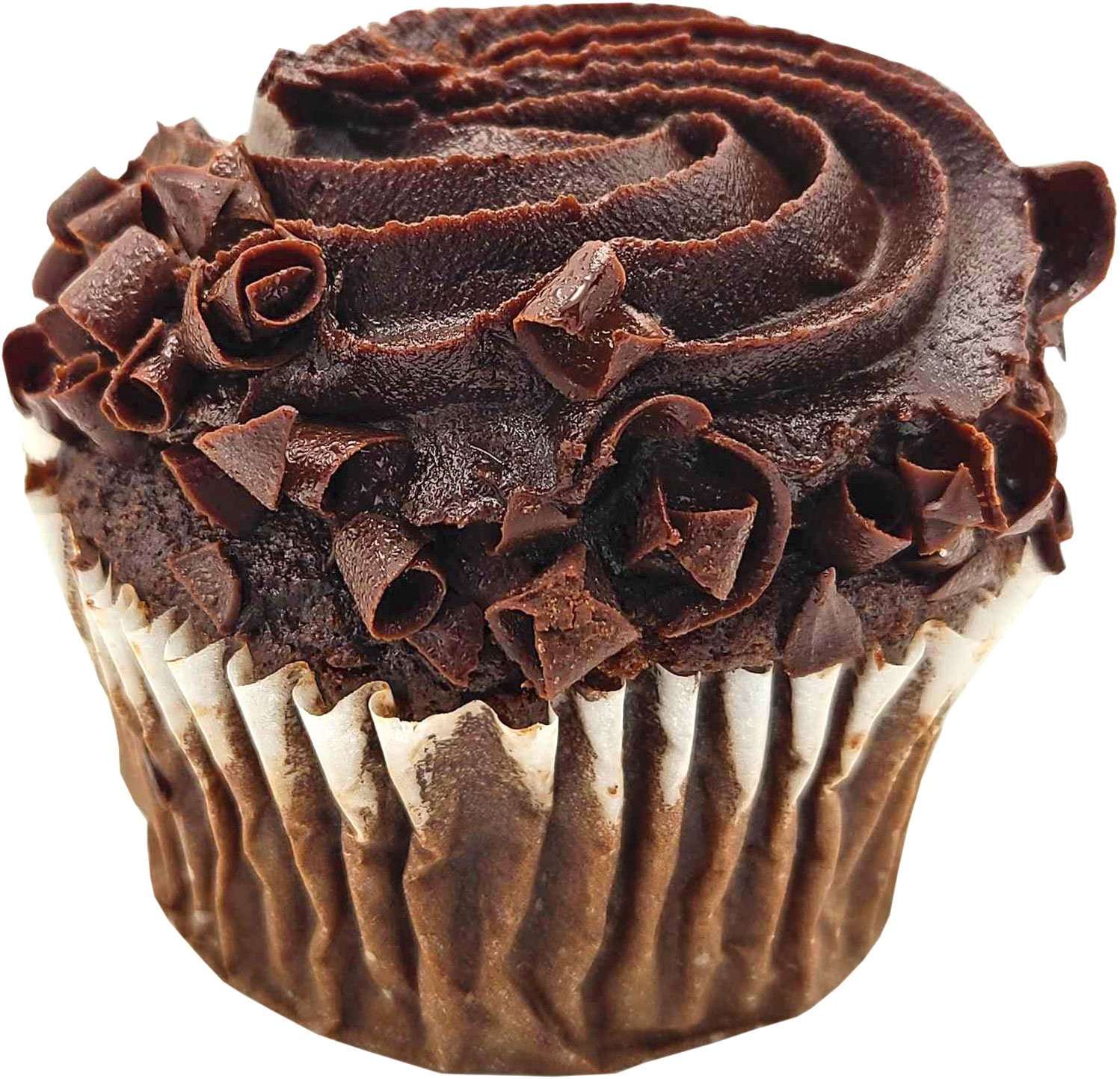 Chocolate cupcake topped with a rich chocolate mousse and chocolate shavings.