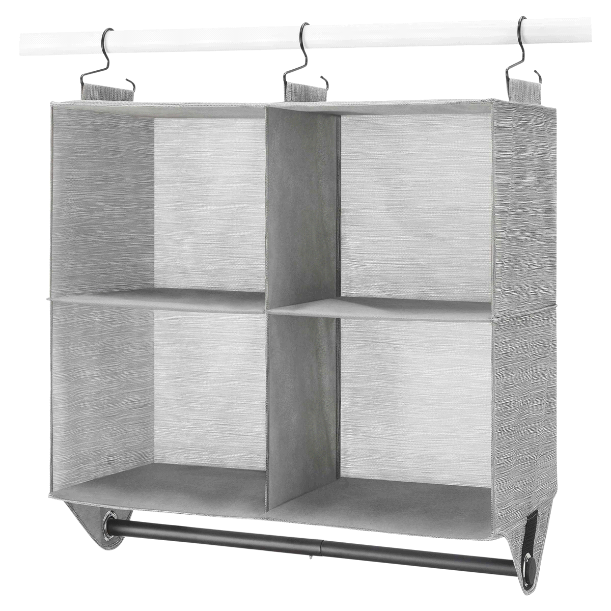 Bringing organization home. Organizes hanging and folded garments in one convenient location. 4 large cubbies neatly store sweaters, bags and accessories. Metal garment rod provides extra hanging spac…