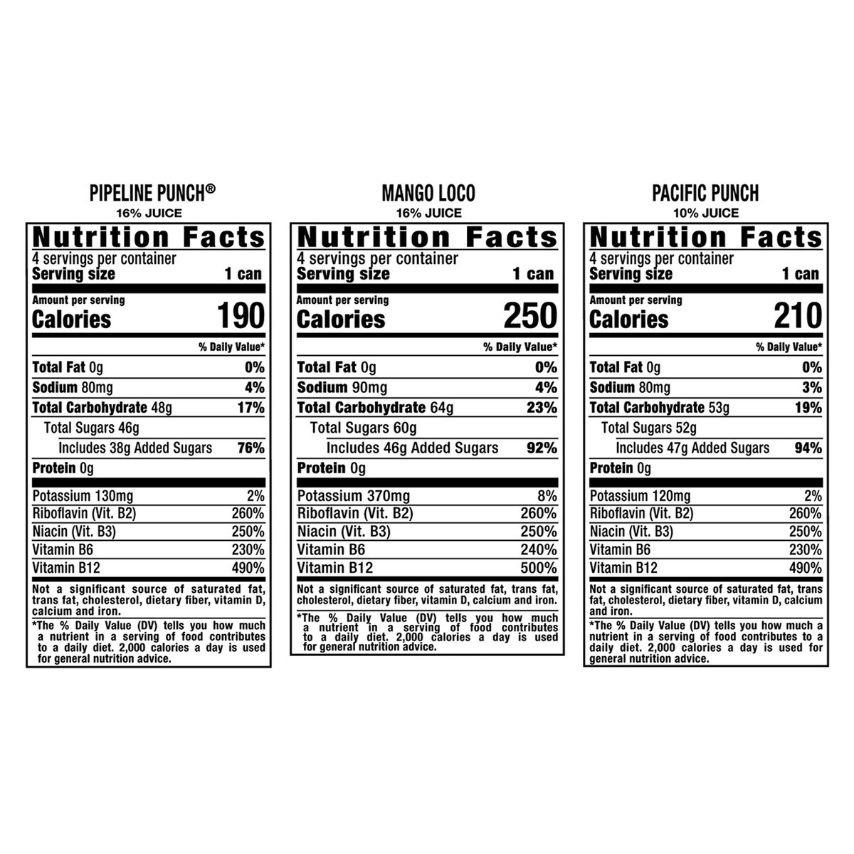 Pipeline Punch: Carbonated Water, Sugar, Glucose, Apple Juice Concentrate, Orange Juice Concentrate, Taurine, Citric Acid, Guava Puree, Sodium Citrate, Potassium Sorbate (Preservative), Panax Ginseng …