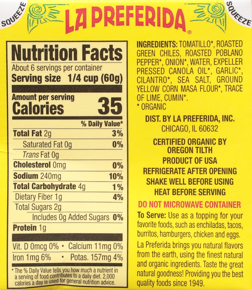 Tomatillo*\, Water\, Roasted Green Chiles*\, Onion*\, Expeller Pressed Canola Oil*\, Garlic*\, Sea Salt\, Cilantro*\, Ground Yellow Corn Masa Flour* (Corn*\, Lime*)\, Cumin*. * Organic.