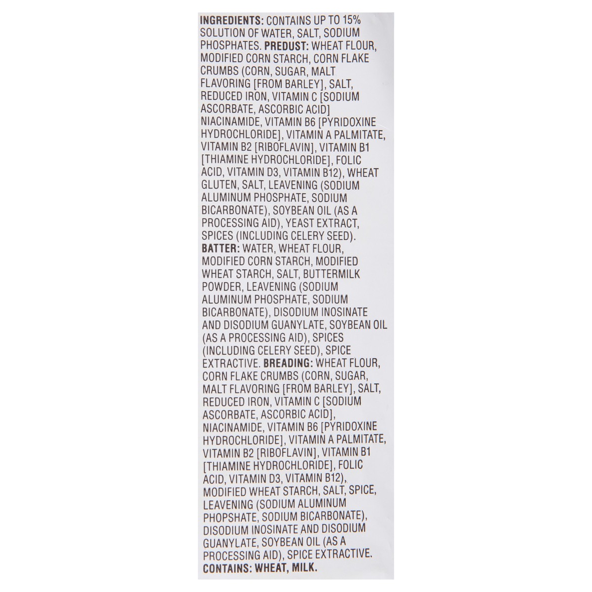 Contains Up to 15% Solution of Water, Salt, Sodium Phosphates. Predust: Wheat Flour, Modified Corn Starch, Corn Flake Crumbs (Corn, Sugar, Malt Flavoring [from Barley], Salt, Reduced Iron, Vitamin C […