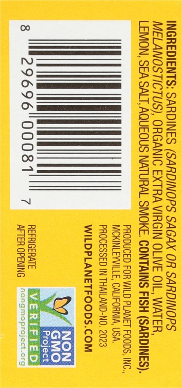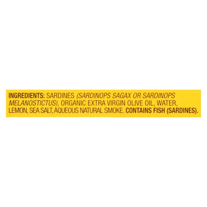 Sardines (Sardinops Sagax or Sardinops Melanostictus), Organic Extra Virgin Olive Oil, Water, Lemon, Sea Salt, Aqueous Natural Smoke.