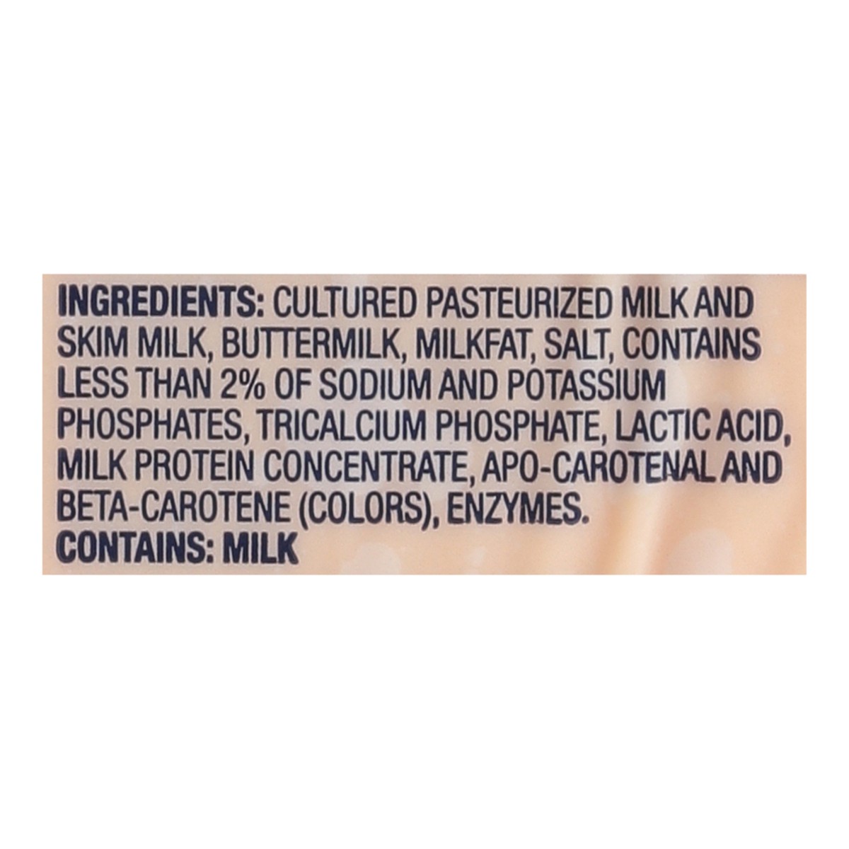 Cultured Pasteurized Milk and Skim Milk, Buttermilk, Milkfat, Salt, Contains Less than 2% of Sodium and Potassium Phosphates, Tricalcium Phosphate, Lactic Acid, Milk Protein Concentrate, Apo-Carotenal…