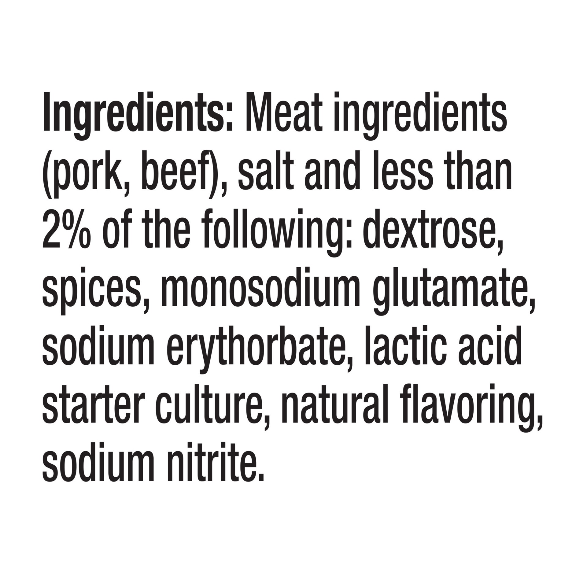 Ingredients: Meat ingredients (pork, beef), salt and less than 2% of the following: dextrose, spices, monosodium glutamate, sodium erythorbate, lactic acid starter culture, natural flavoring, sodium n…