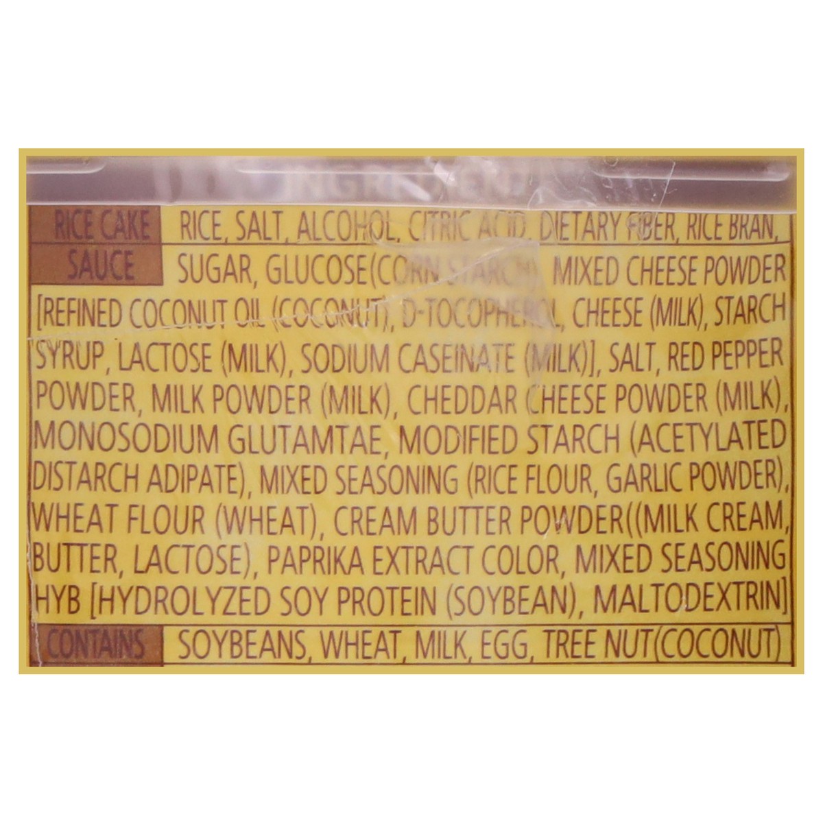 Rice Cake: Rice, Salt, Alcohol, Citric Acid, Dietary Fiber, Rice Bran, Sauce: Sugar, Glucose (Corn Starch), Mixed Cheese Powder [Refined Coconut Oil (Coconut), D-Tocopherol, Cheese (Milk), Starch Syru…