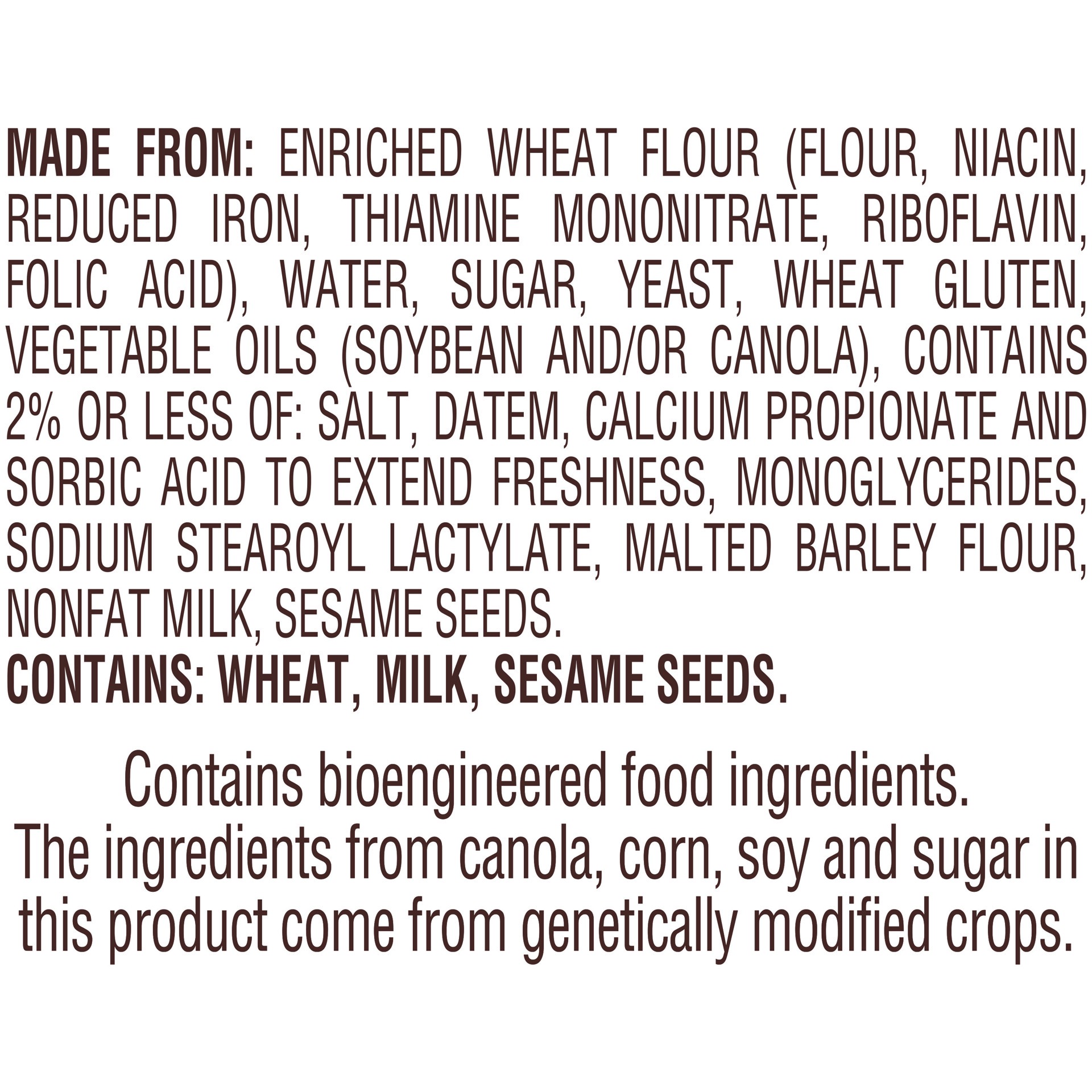 MADE FROM: ENRICHED WHEAT FLOUR (FLOUR, NIACIN, REDUCED IRON, THIAMINE MONONITRATE, RIBOFLAVIN, FOLIC ACID), WATER, SUGAR, YEAST, WHEAT GLUTEN, VEGETABLE OILS (SOYBEAN AND/OR CANOLA), CONTAINS 2% OR L…