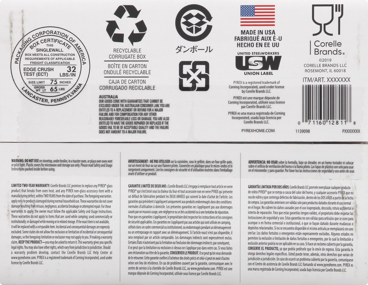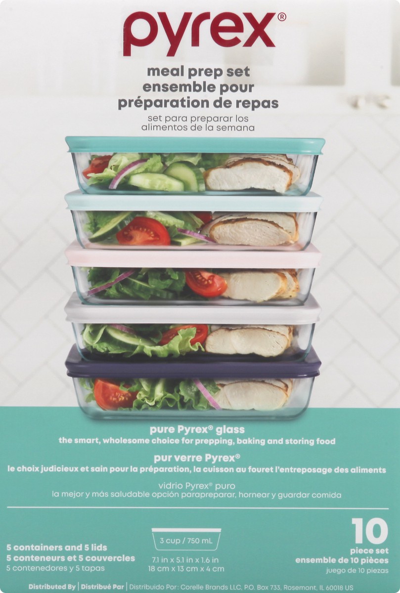 3 cup/750 ml. 7.1 in x 5.1 in x 1.6 in 18 cm x 13 cm x 4 cm. Meal prep set. Pure Pyrex Glass: The smart, wholesome choice for prepping, baking and storing food. Refrigerator and freezer safe. Microwav…