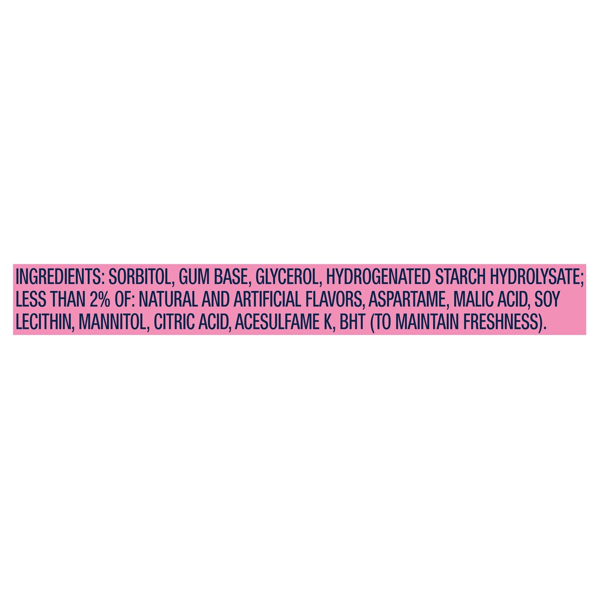 SORBITOL, GUM BASE, GLYCEROL, HYDROGENTATED STARCH HYDROLYSATE; LESS THAN 2% OF: NATURAL AND ARTIFICIAL FLAVORS, ASPARTAME, MALIC ACID, SOY LECITHIN, MANNITOL, CITRIC ACID, ACESULFAME K, BHT (TO MAINT…