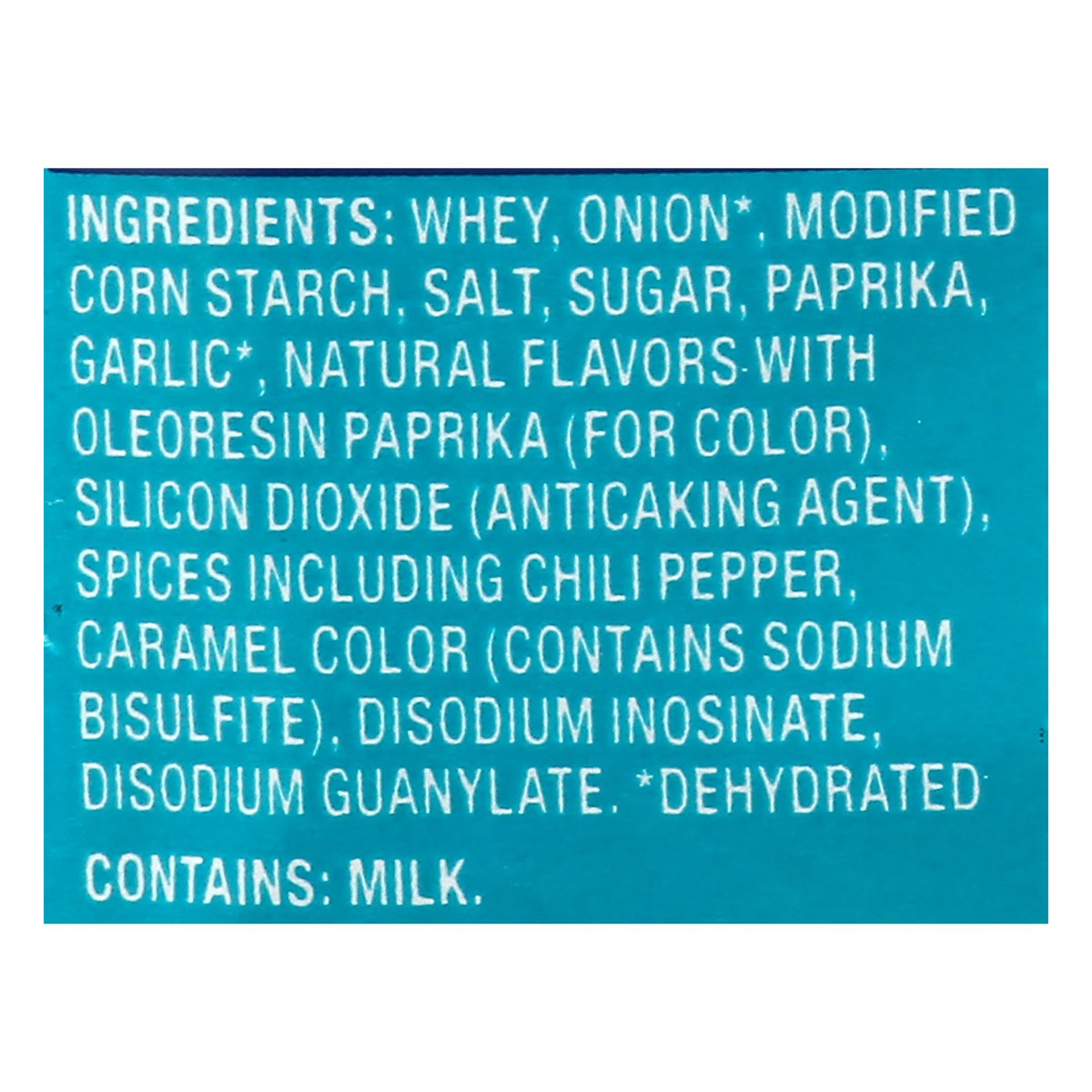 Whey, Onion (Dehydrated), Modified Corn Starch, Salt, Sugar, Paprika, Garlic (Dehydrated), Natural Flavors with Oleoresin Paprika (for Color), Silicon Dioxide (Anticaking Agent), Spices Including Chil…