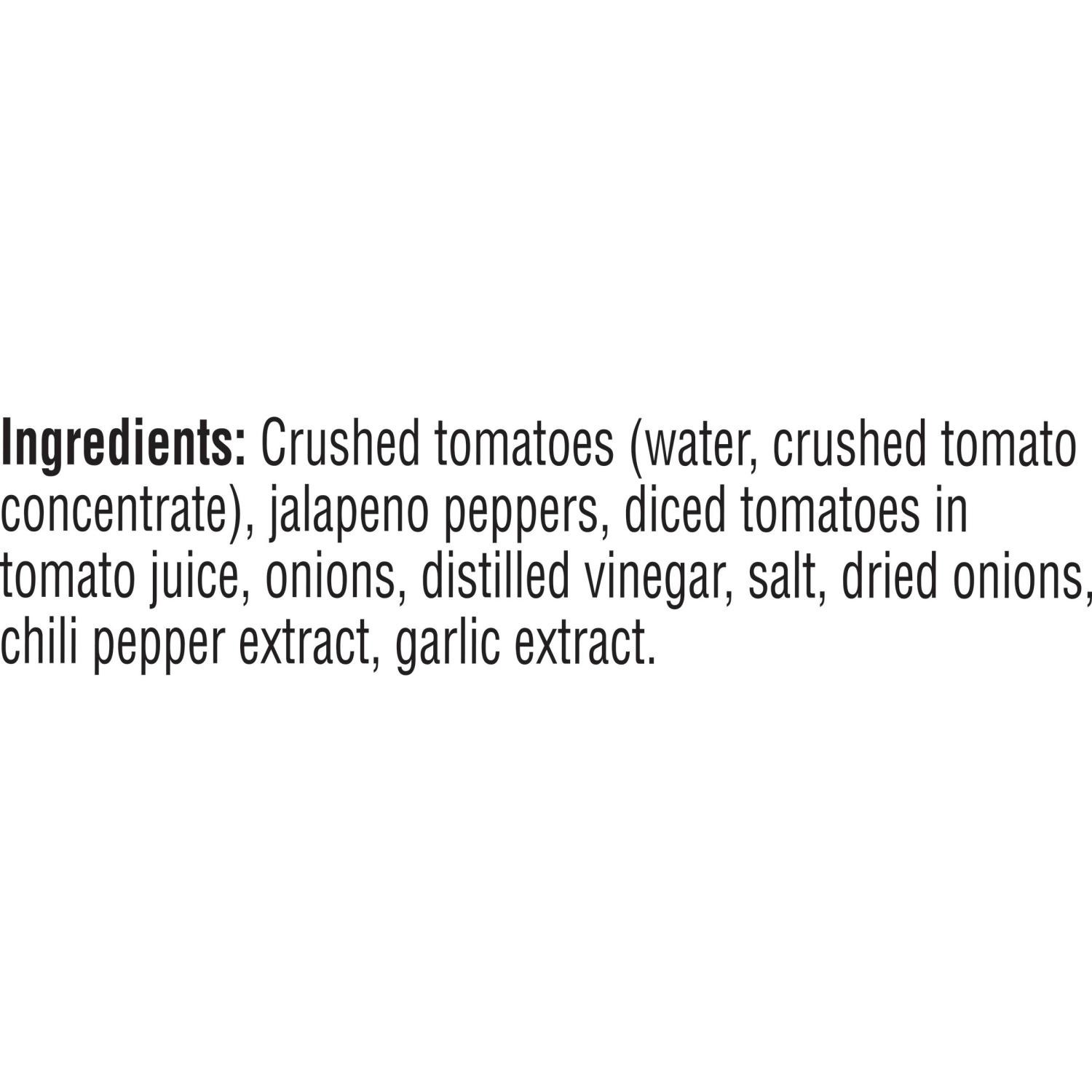 INGREDIENTS: CRUSHED TOMATOES (WATER, CRUSHED TOMATO CONCENTRATE), JALAPENO PEPPERS, DICED TOMATOES IN TOMATO JUICE, ONIONS, DISTILLED VINEGAR, SALT, DRIED ONIONS, CHILI PEPPER EXTRACT, GARLIC EXTRACT…