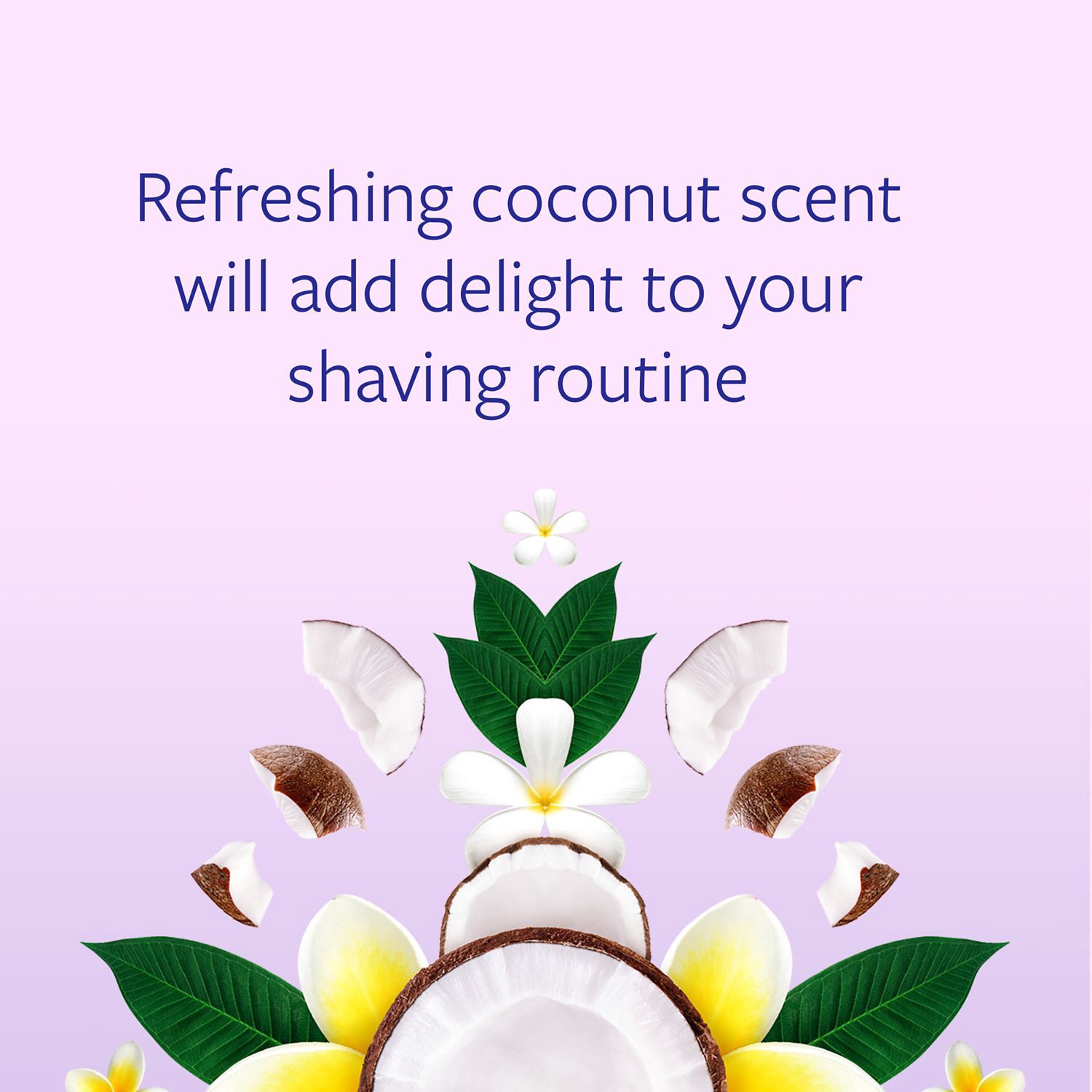 - Coconut Delight shave gel blends cool coconut water and exotic plumeria petals for a refreshing scent that transforms your bathroom into a tropical paradise.