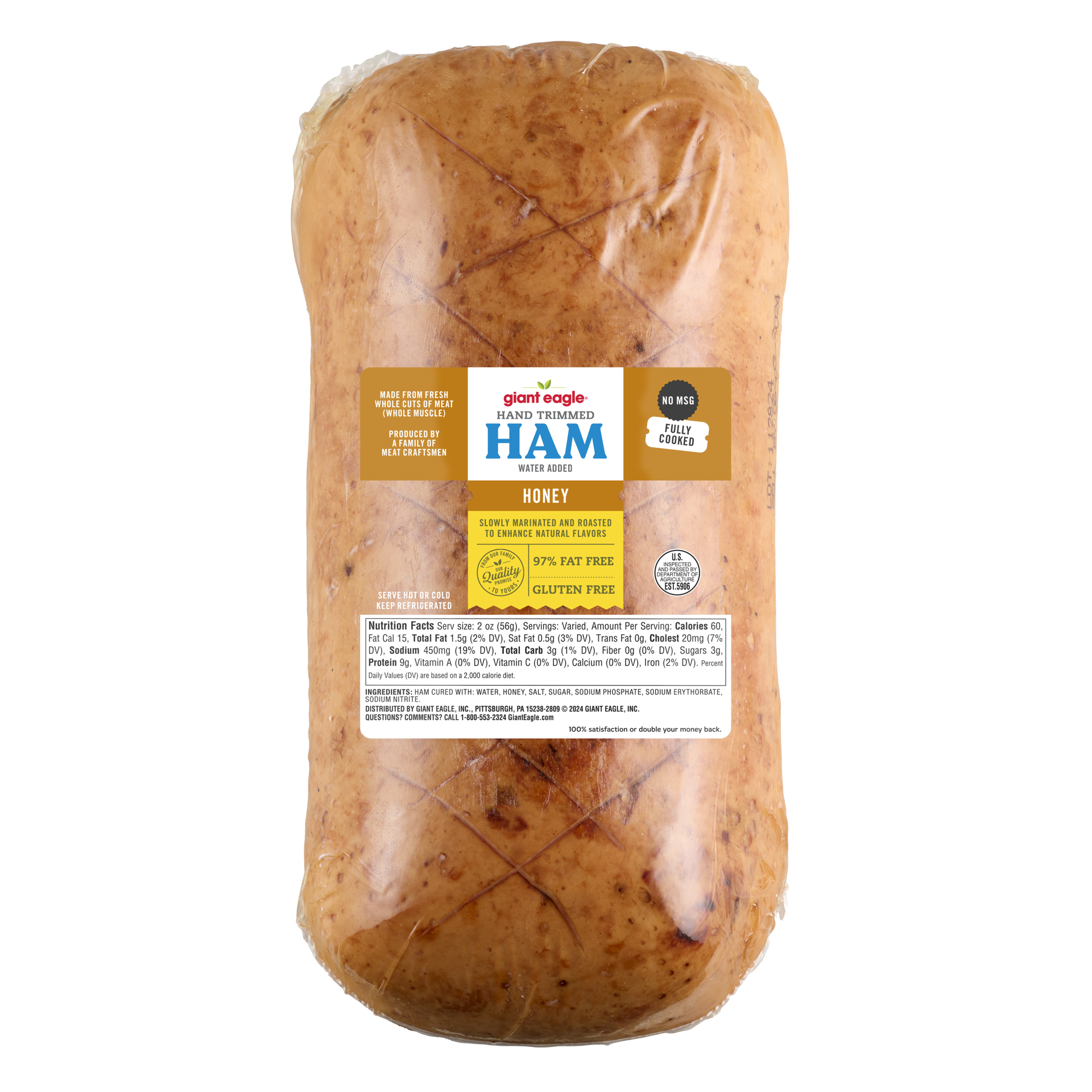 US Inspected Hand Trimmed Ham, Honey Flavor Which Is Slowly Marinated And Roasted TO Enhance Natural Flavors. Fully Cooked and No MSG.