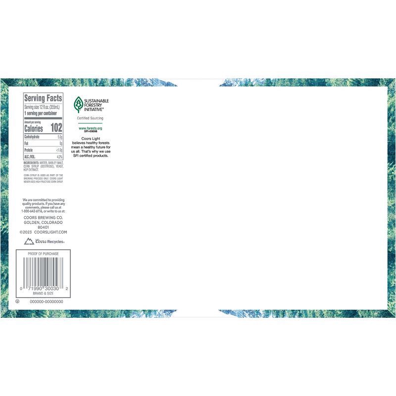 Coors Light American Beer, known as The World's Most Refreshing Beer, is a crisp, clean, and refreshing American-style light lager. With a 4.2% ABV, 102 calories, and 5 grams of carbs per 12-ounce ser…