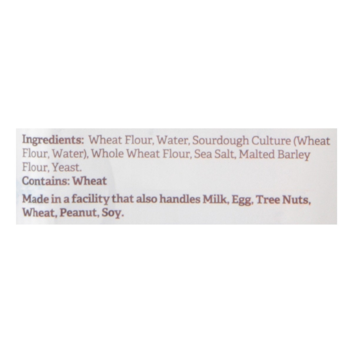 Wheat Flour, Water, Sourdough Culture (Wheat Flour, Water), Whole Wheat Flour, Sea Salt, Malted Barley Flour, Yeast.
