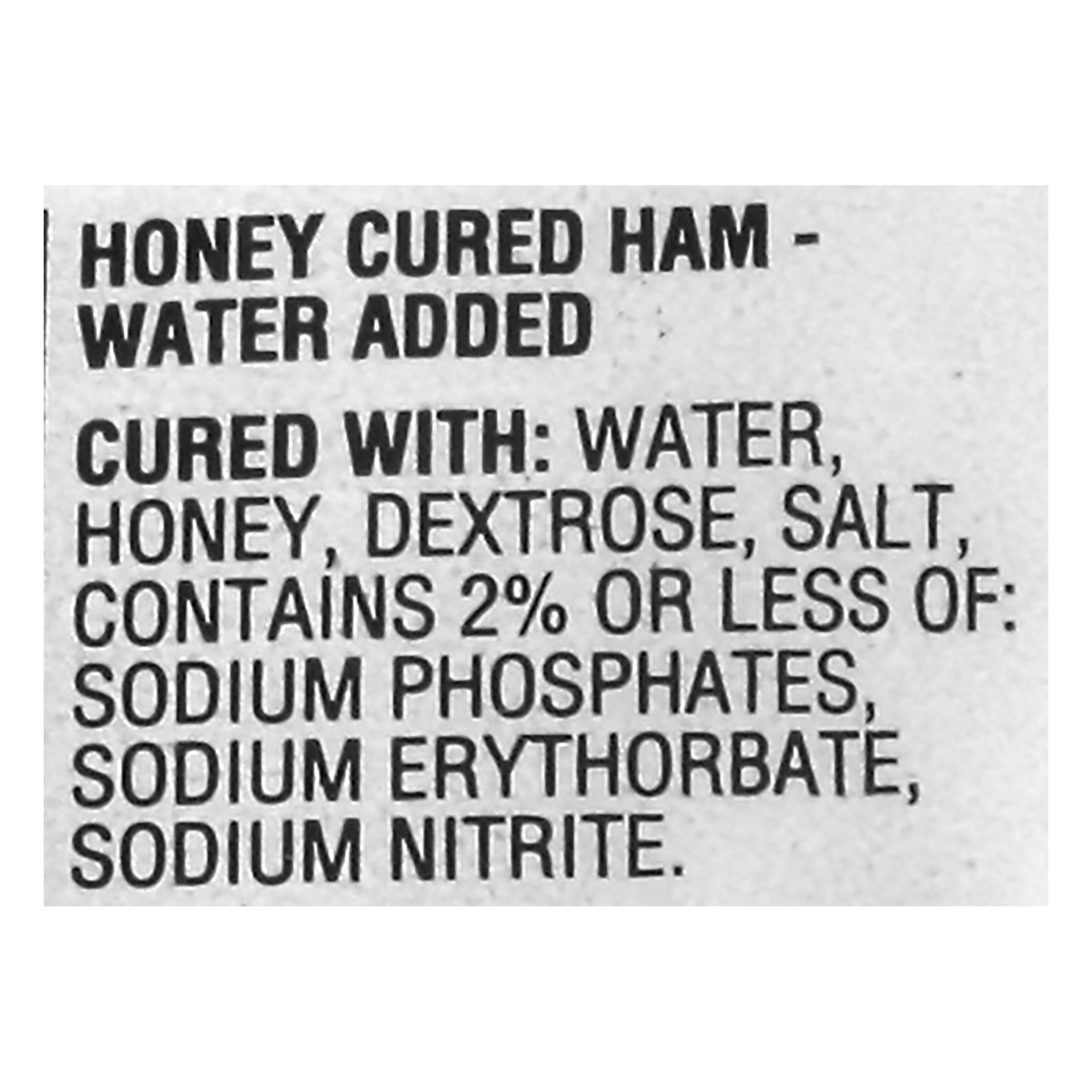 Cured with: Water, Honey, Dextrose, Salt, Contains 2% or Less of: Sodium Phosphates, Sodium Erythorbate, Sodium Nitrite.